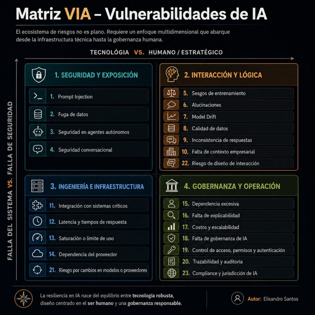Cuando armé VIA, la matriz de vulnerabilidades de la IA, lo hice porque veía siempre el mismo problema: las empresas discutían “riesgo de IA” como si fuera una sola cosa, cuando en realidad estaban mezclando fallas del modelo, fallas de seguridad, deuda de infraestructura, errores de diseño conversacional, problemas de permisos, dependencia de proveedores, falta de auditoría y ausencia de gobierno en la misma bolsa.